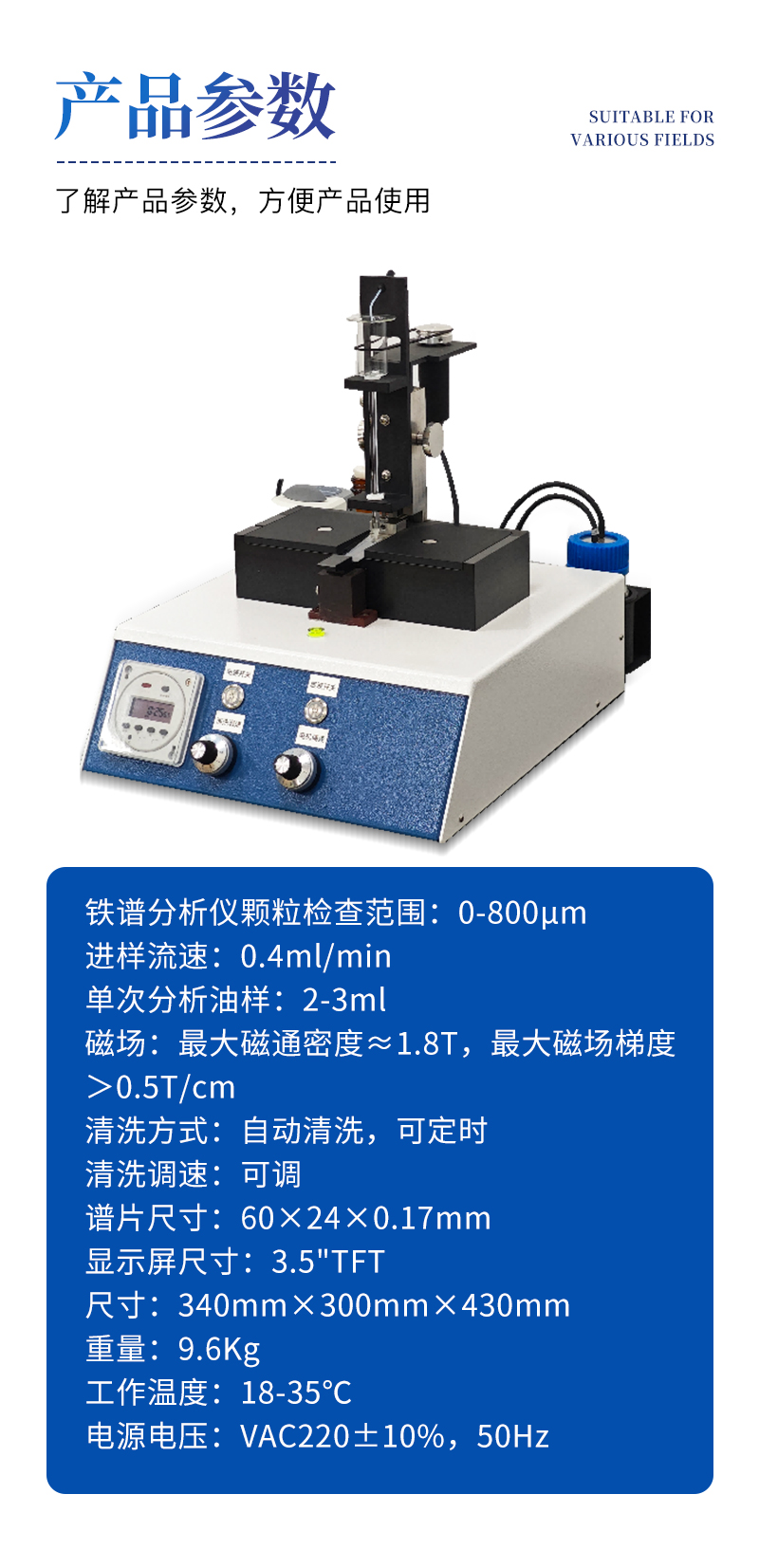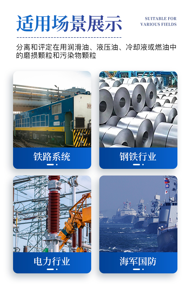 (14)應(yīng)用范圍:用以分離和評(píng)定在用潤(rùn)滑油、液壓油、冷卻液或燃油中的磨損顆粒和污染物顆粒;