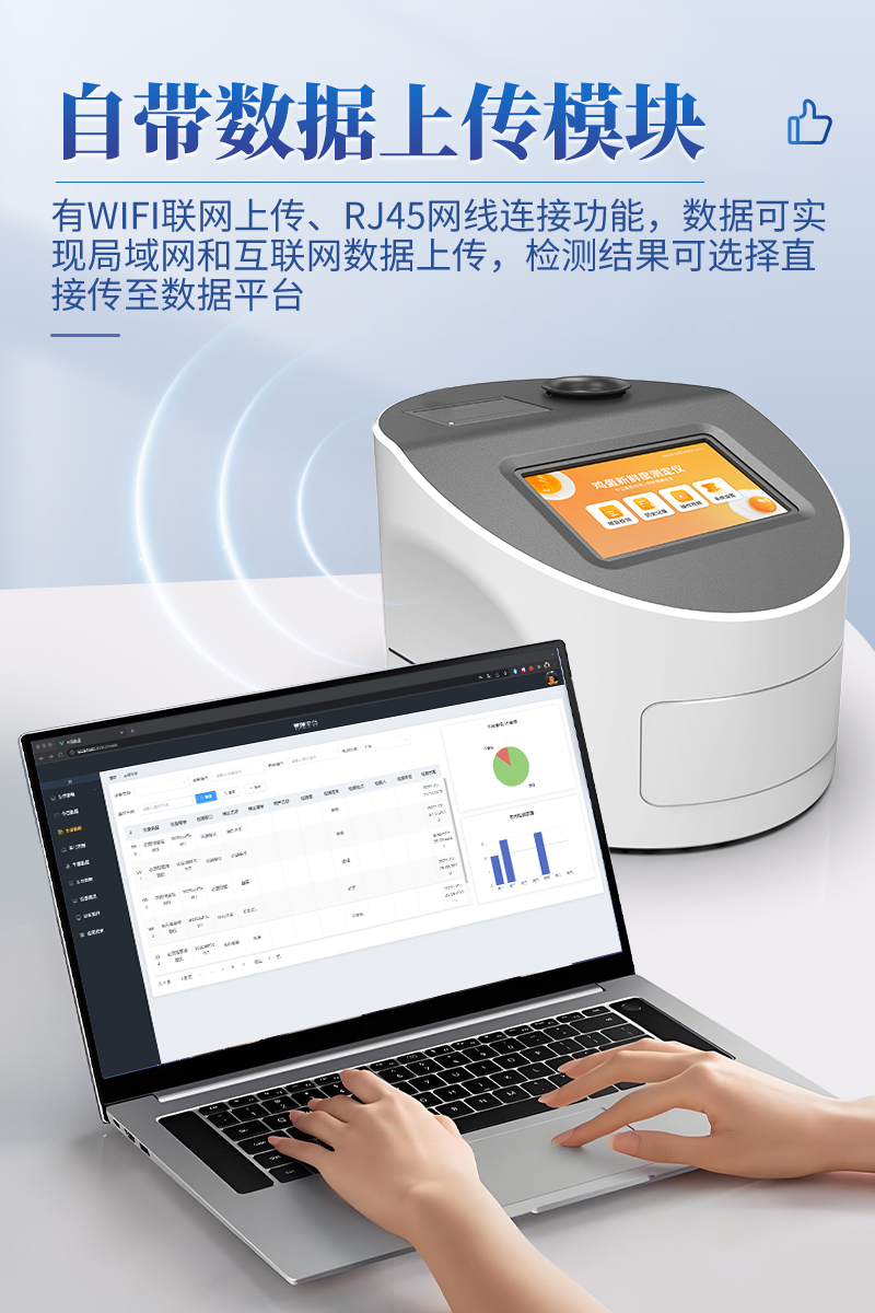 7.儀器可本機(jī)存儲(chǔ)數(shù)據(jù),可連接USB端口將數(shù)據(jù)導(dǎo)出存儲(chǔ)。另外,儀器自帶數(shù)據(jù)上傳模塊,具有WIFI聯(lián)網(wǎng)上傳、RJ45網(wǎng)線連接功能,數(shù)據(jù)可實(shí)現(xiàn)局域網(wǎng)和互聯(lián)網(wǎng)數(shù)據(jù)上傳,檢測(cè)結(jié)果可選擇直接傳至數(shù)據(jù)平臺(tái),進(jìn)行大數(shù)據(jù)分析處理與數(shù)據(jù)統(tǒng)計(jì),達(dá)到長(zhǎng)期分析監(jiān)測(cè)的目的。